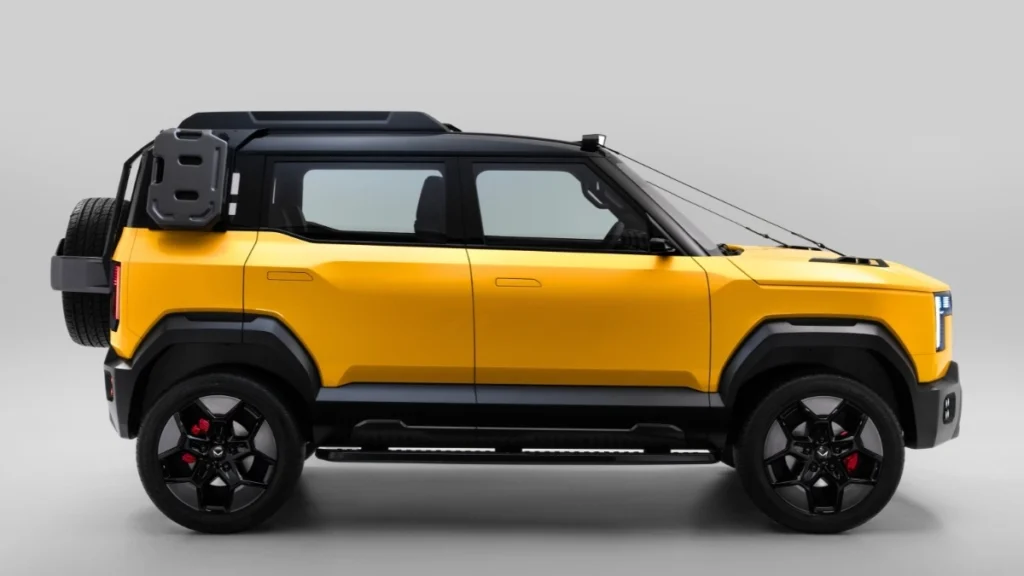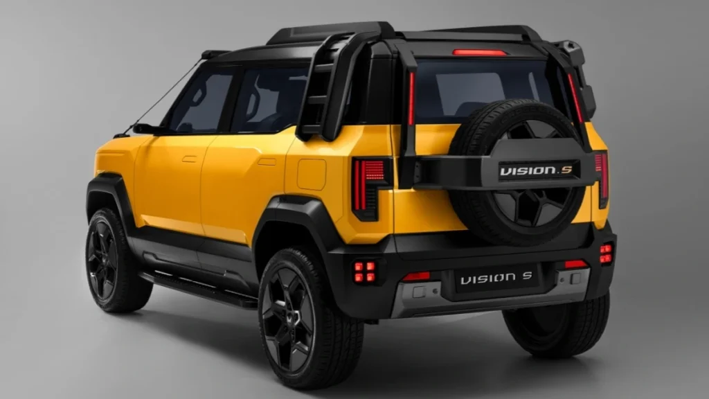 Mahindra Vision S SUV का boxy silhouette और sharp lines इसे Scorpio N की याद दिलाते हैं। इसका front fascia inverted L-shaped LED headlights और pixel-style fog lamps के साथ बेहद आकर्षक है। flush-fitting door handles, 19-inch star-shaped wheels, और camera-based ORVMs इसे modern और sleek बनाते हैं। पीछे की तरफ side-hinged tailgate पर spare wheel और inverted L-shaped taillights इसे rugged और premium look देते हैं। इसकी तुलना कुछ लोग baby Defender से कर रहे हैं।
